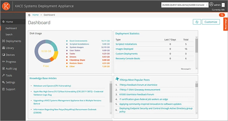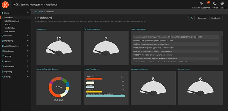 KACE® by Quest supports your unified endpoint management (UEM) strategy by helping you discover and track every device in your environment, automate administrative tasks, keep compliance requirements up-to-date and secure your data from a range of vulnerabilities.